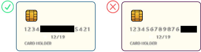 - Only the first 4 digits and last 4 digits of the card must be visible
